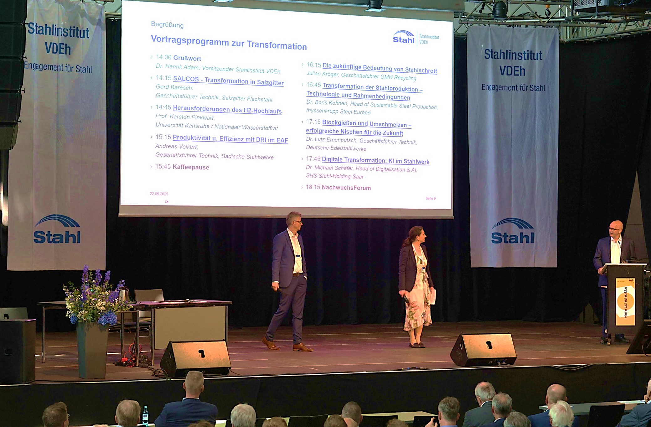 Das Programm begann am Morgen mit der Mitgliederversammlung des Stahlinstituts VDEh, zu der sich 200 persönliche Mitglieder angemeldet hatten. In der Mittagspause wurden Museumsführungen durch die Henrichshütte sowie der Besuch der Fotoausstellung „The Beauty of Steel“ angeboten. Den Nachmittag füllte eine Vortragsveranstaltung zur „Transformation der Stahlindustrie“, in der die zwei deutschen Protagonisten – thyssenkrupp Steel Europe AG und die Salzgitter AG – ihre Wege zur CO2-Neutralität vorstellten. Weiterhin gab es Vorträge zum Wasserstoffhochlauf, zu den Rohstoffen Direct Reduced Iron (DRI) und Stahlschrott, zu den Erfolgsnischen Blockgießen und Umschmelzen sowie zu KI im Stahlwerk. Im Anschluss daran hatte der VDEh ein Nachwuchsforum organisiert, in dem 17 junge WissenschaftlerInnen der RWTH Aachen und der Universität Duisburg-Essen in einem „Speed Presenting“ ihre Forschungsprojekte vorstellten. Der Tag schloss mit der traditionellen abendlichen Partyveranstaltung „StahlTreff“ mit Jazzband sowie Speis und Trank.