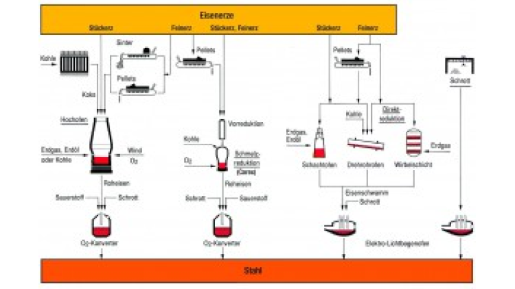 Die Stahlerzeugung wird durch zwei wesentliche Verfahrensrouten gekennzeichnet: durch den Weg vom „Eisenerz zum Stahl“ und durch den Weg vom „Schrott zum Stahl“. Bei der eisenerzbasierten Route wird meistens aus oxydischen Eisenerzen im Hochofen, seltener in Schmelz-reduktionsanlagen Roheisen erzeugt, das im Sauerstoffkonverter zu Rohstahl verarbeitet wird. In Direktreduktionsanlagen aus Eisenerzen hergestellter Eisenschwamm (Direct Reduced Iron (DRI); Hot Briquetted Iron (HBI)) wird im Elektrolichtbogenofen zu Rohstahl umgewandelt. Bei der schrottbasierten Route wird durch Recyceln von Stahlschrott im Elektrolichtbogenofen Rohstahl hergestellt.